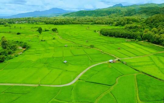 Rice is primarily grown, a staple food in many regions. Bananas and various fruit tree varieties are also cultivated. These crops contribute not only to food security but also to local economies and farmers' livelihoods. Bamboo cultivation also plays a significant role, as bamboo is used for various applications, such as building materials and crafts. Together, these crops contribute to a diverse and sustainable agricultural system.
